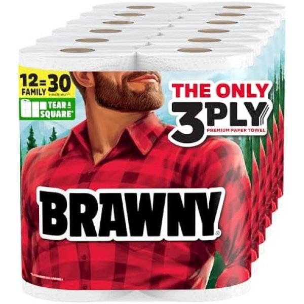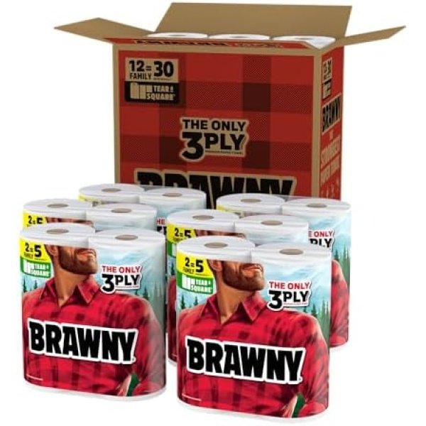 Brawny Tear-A-Square 3-Ply Paper Towels, 12 XL Family Rolls = 30 Regular Rolls