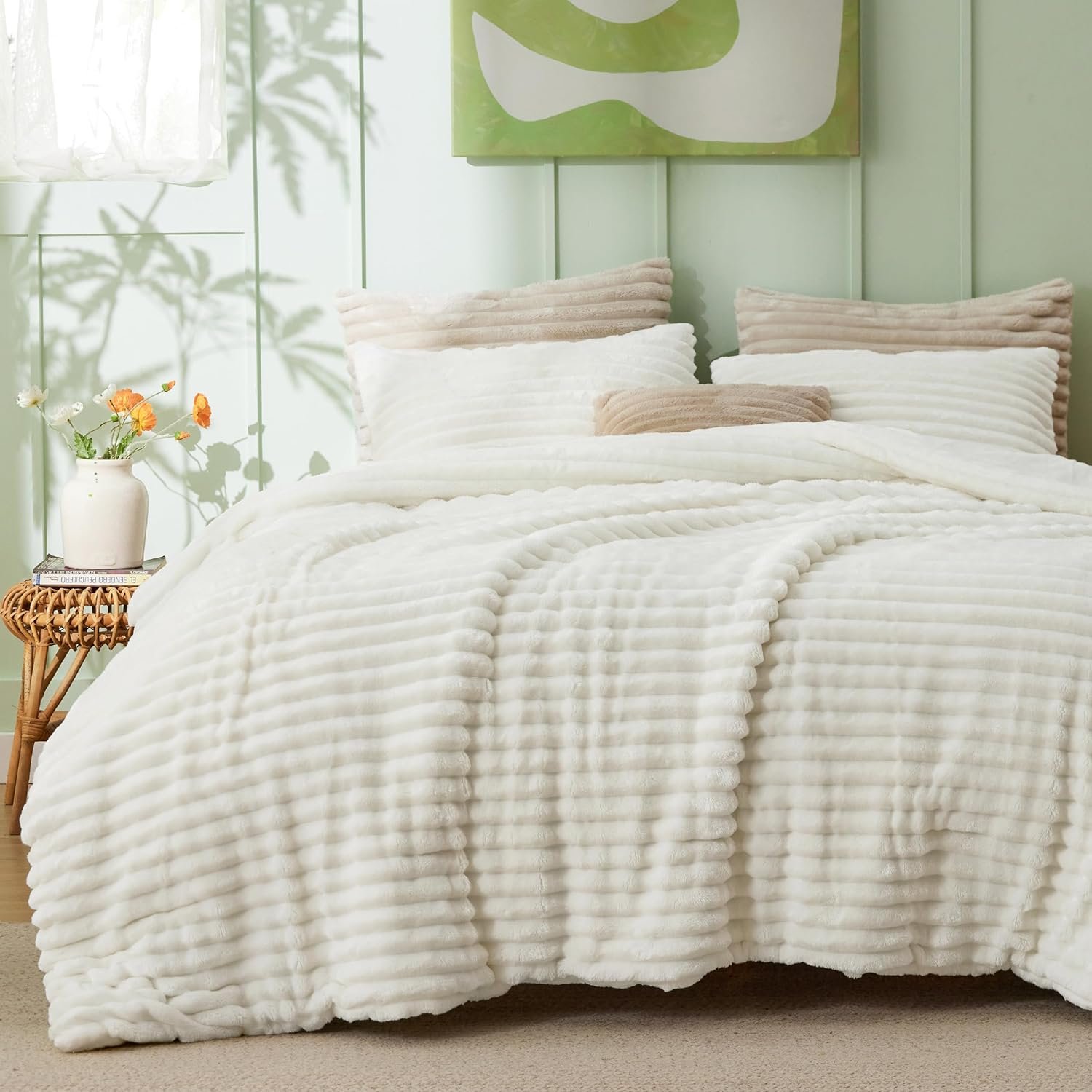 Bedsure Fluffy Comforter Set Queen – Super Soft Faux Fur Bed Set Cream White,