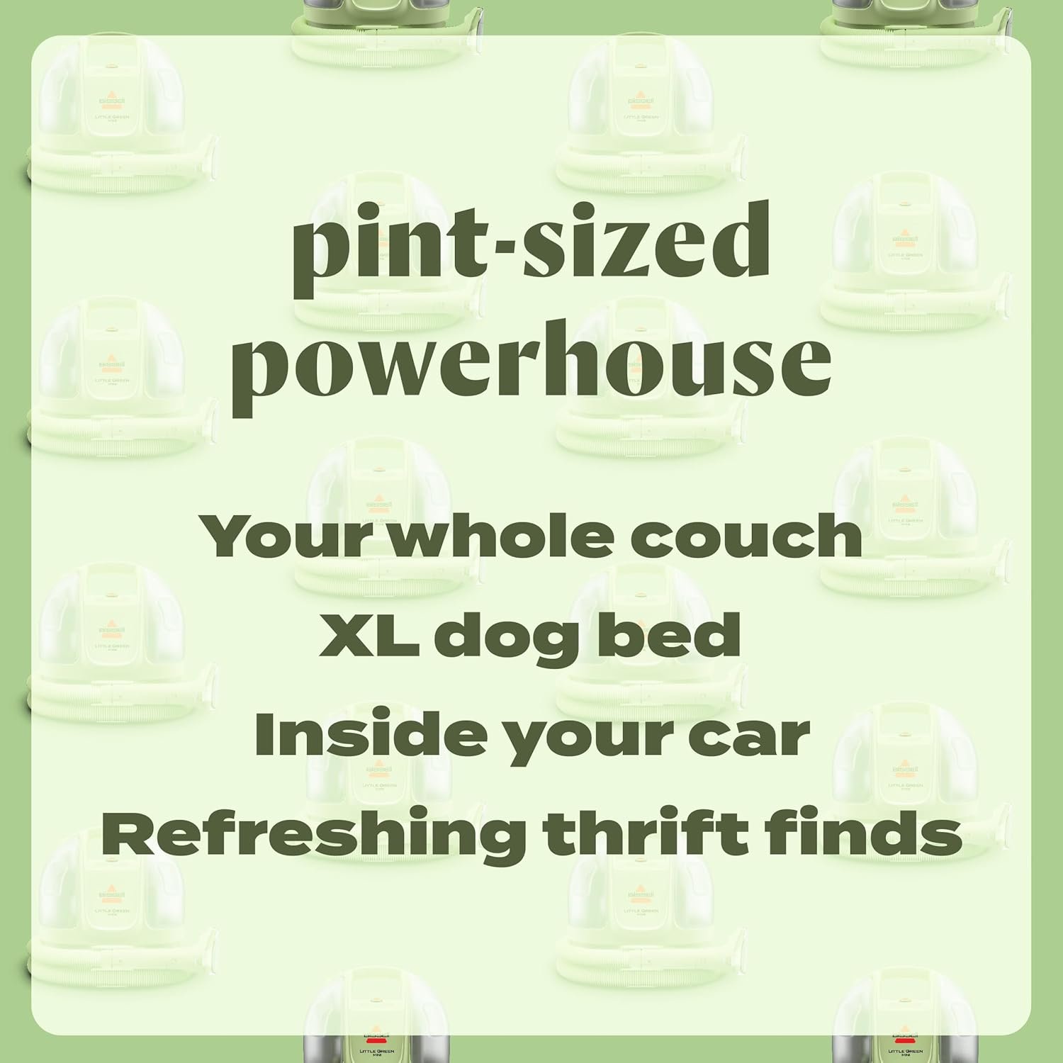 Save on space without sacrificing on cleaning ability. Use BISSELL® Little Green® Mini portable upholstery and carpet cleaner to spray, scrub and lift away tough messes, like dirt and stains, from all types of surfaces. Easily access hard-to-clean spaces like staircases or car interiors with Little Green® Mini portable deep cleaner’s lightweight and compact design. Every purchase makes it possible for BISSELL to continue our support of BISSELL Pet Foundation® and its mission of saving pets in need. Since 2011, BISSELL has donated over $26 million in support of BISSELL Pet Foundation®. When you purchase a BISSELL® product, you help save pets, too. Our products are engineered to clean even the toughest messes so pets can stay at home and out of shelters.