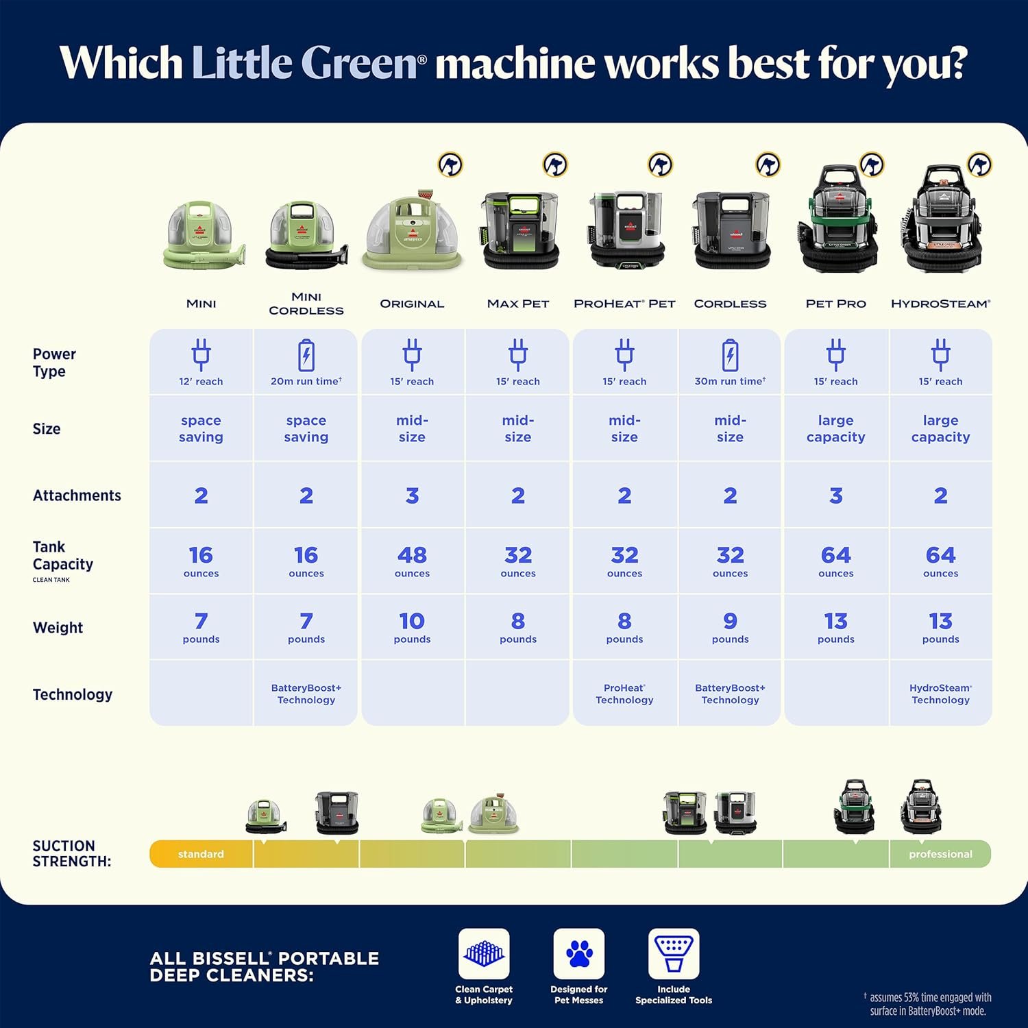 INCLUDES: 4” Tough Stain Tool with removeable lens, HydroRinse self-cleaning hose tool, and 8oz. BISSELL Little Green Formula.