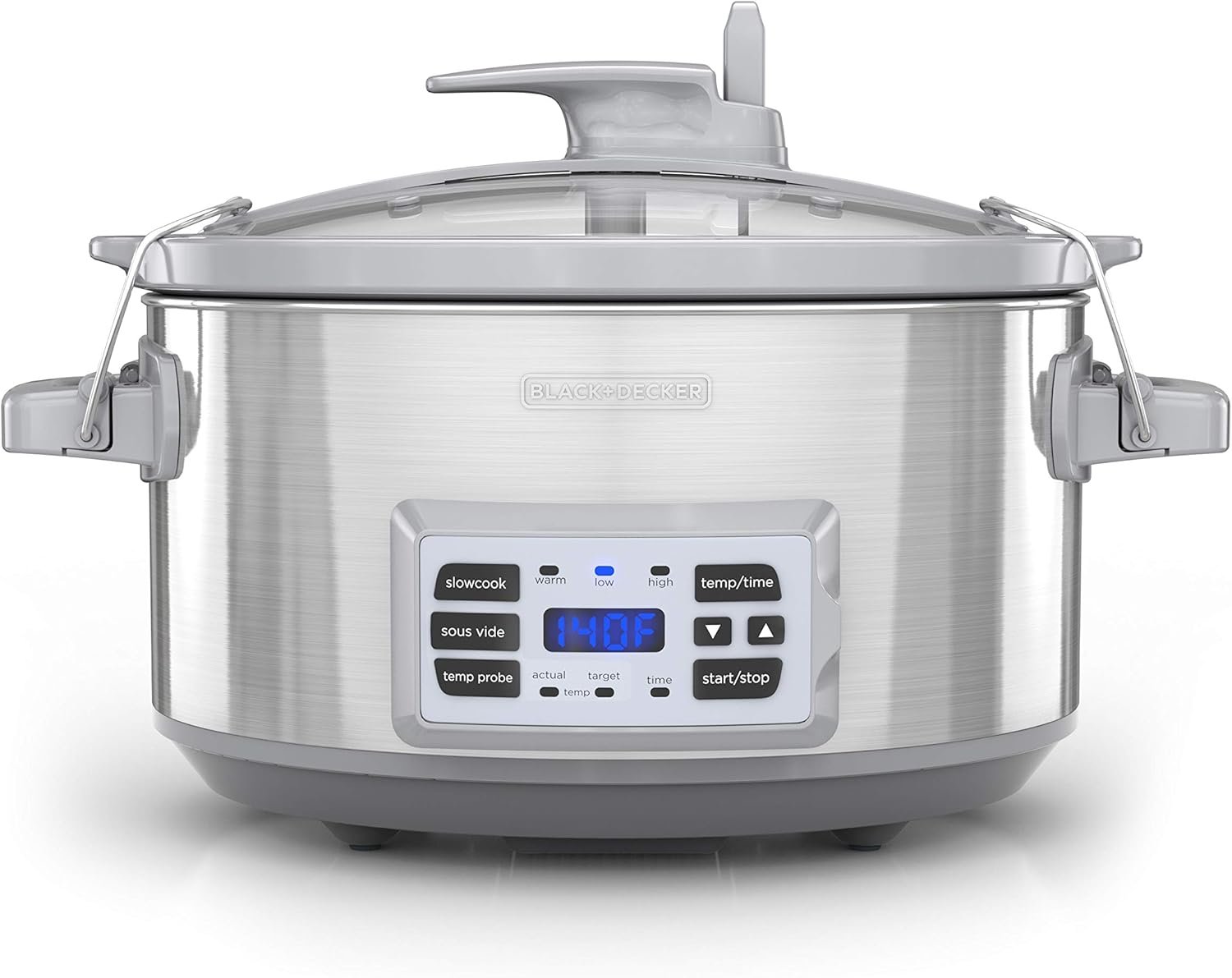 The BLACK+DECKER 7-Quart Digital Slow Cooker with Temperature Probe + Precision Sous-Vide gives you three ways to cook 1 ) Classic slow cooking is simple in the 7-quart stoneware crock Just add in the ingredients and let the low constant heat go to work on roasts soups chilis and so much more! 2 ) Use the temperature probe to achieve ideal results on a variety of proteins Just set the desired temperature insert the probe into the meat and the slow cooker will do the rest 3 ) For restaurant-quality results without the hassle or guesswork use the Sous-Vide Function Just arrange single servings of food inside the resealable bags set the time and temperature based on what you’re cooking and the level of doneness you prefer and then insert the temperature probe into the water The sous-vide method helps prevent overcooking by heating the water that surrounds the food bringing it to the desired internal temperature When slow cooking three heat settings give you options to find the best temperature for your schedule—Low for 8-9 hours of cooking High for 3-4 hours and Warm for keeping food at the ideal serving temperature Plus cleanup is easy thanks to the dishwasher-safe stoneware pot and tempered glass lid