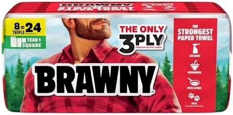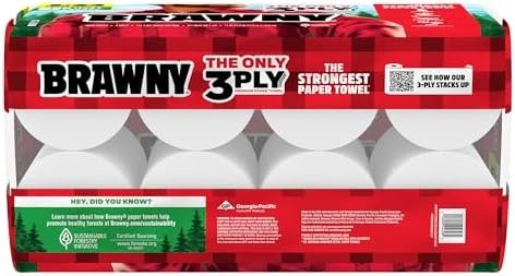 Introducing the Brawny 3-Ply Tear-A-Square Paper Towels — the ultimate solution for all your cleaning challenges. These premium paper towels offer unparalleled strength and absorbency versus other nationally branded retail paper towels, designed to handle everything from minor spills to heavy-duty cleanups with ease. Featuring the innovative Tear-A-Square design, you can select the perfect paper towel size — Quarter, Half, or Full — to match the task at hand, minimizing waste and maximizing efficiency. Imagine the simplicity of having just the right amount of paper towel at your fingertips. Each paper towel roll is crafted to provide more sheets than our regular rolls, ensuring you can change rolls less frequently, making it as convenient as it is effective. Certified by the Sustainable Forestry Initiative, these paper towels reflect a commitment to responsible sourcing and environmental stewardship. Brawny 3-Ply Paper Towels offer superior durability and absorbency versus national branded retail paper towel rolls, great for any cleaning scenario — whether in the home, car, or outdoors. From wiping down kitchen counters to cleaning up after pets, these strong paper towels are made to deliver reliable performance every time. Experience the peace of mind that comes with having a powerful cleaning ally in your household. Choose Brawny 3-Ply Tear-A-Square Paper Towels for a responsible and reliable solution that meets all your cleaning needs. Experience the difference today.