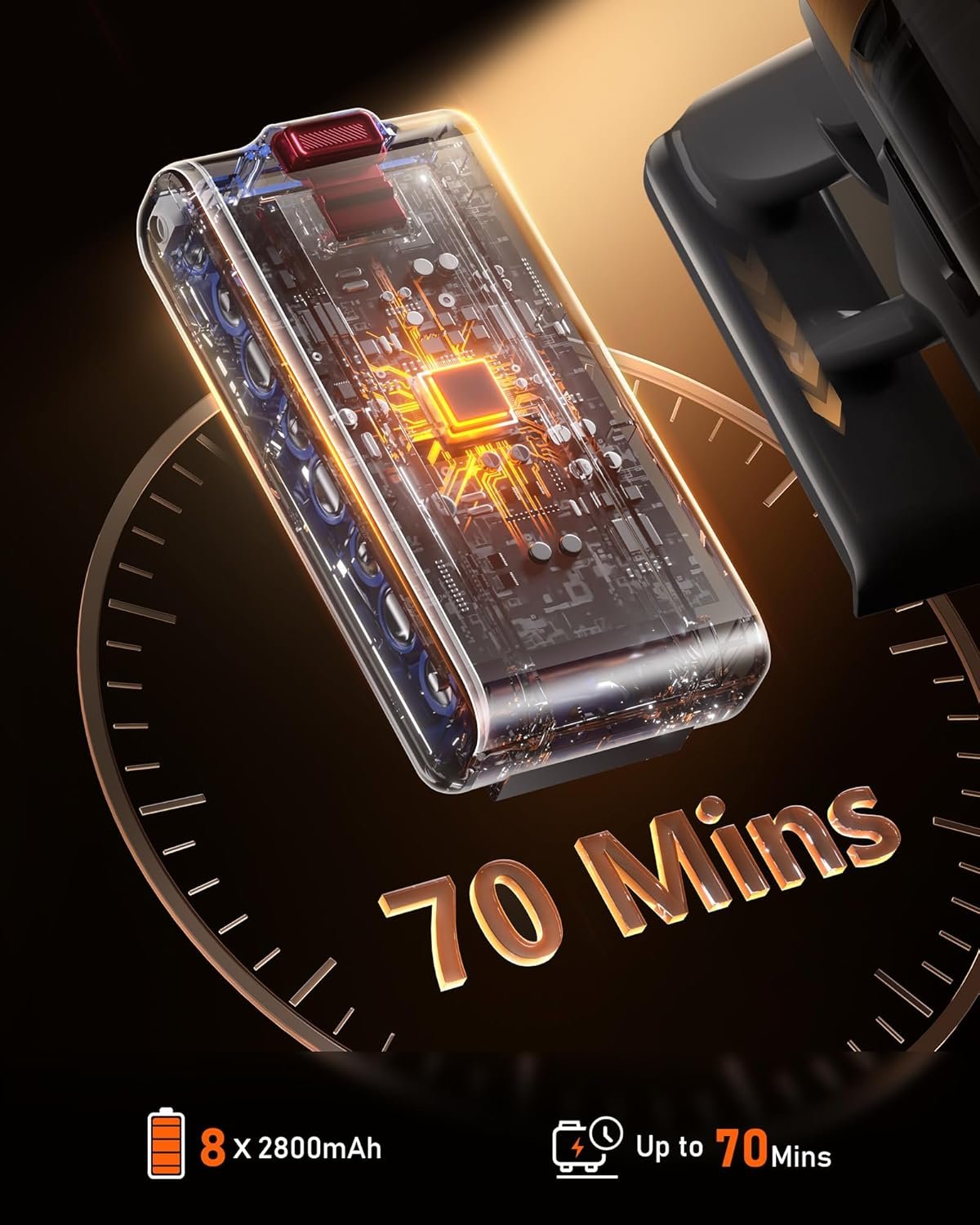 【70 Mins Runtime & Wall-Mount Charging】: Features an 8x2800mAh battery pack for up to 70 minutes of continuous runtime on MIN mode (40 mins on MID, 20 mins on MAX). The convenient wall-mount design allows for easy storage and charging, ideal for apartments, offices, or homes up to 350㎡.