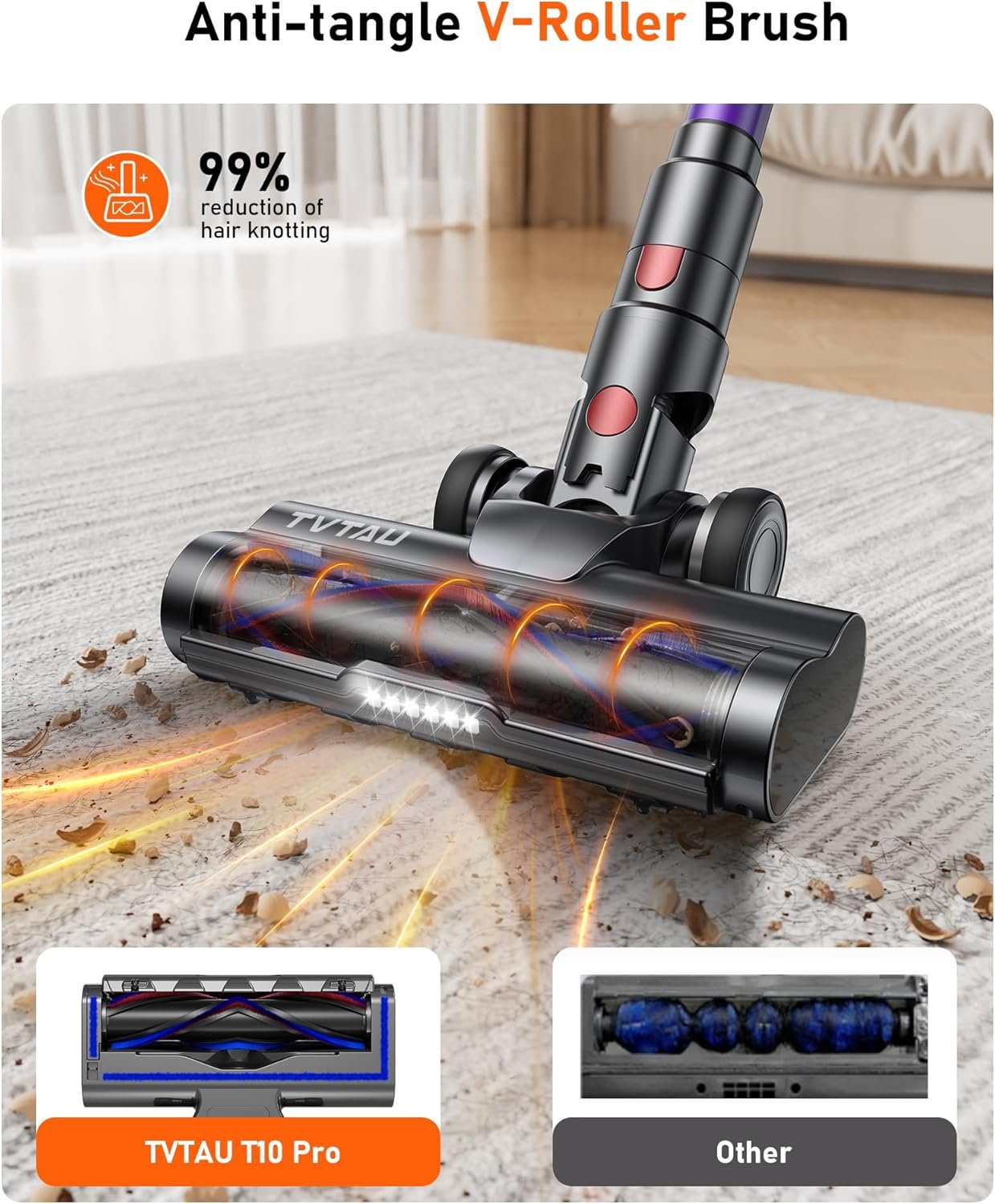 【V-Shape Anti-Tangle Brushroll】: The specially designed V-shape brushroll effectively resists hair wrap. A combination of soft and stiff bristles deep cleans carpets while being gentle on hard floors, seamlessly transitioning between different surfaces.