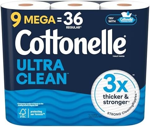 WHAT’S INCLUDED — This toilet paper pack includes 9 Mega Rolls of Cottonelle Ultra Clean 1-Ply Toilet Paper with 284 sheets per roll (269.10 square feet total); packaging may vary