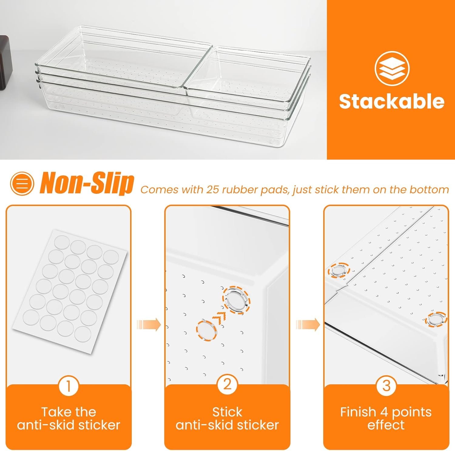 【Stackable & Non-Slip Design】Comes with 25 non-slip silicone pads stickers, when the drawer suddenly opens or closes, the silicone pads will hold these organizers firmly in place. When not in use, the boxes can be stacked on top of each other to maximize your storage space.