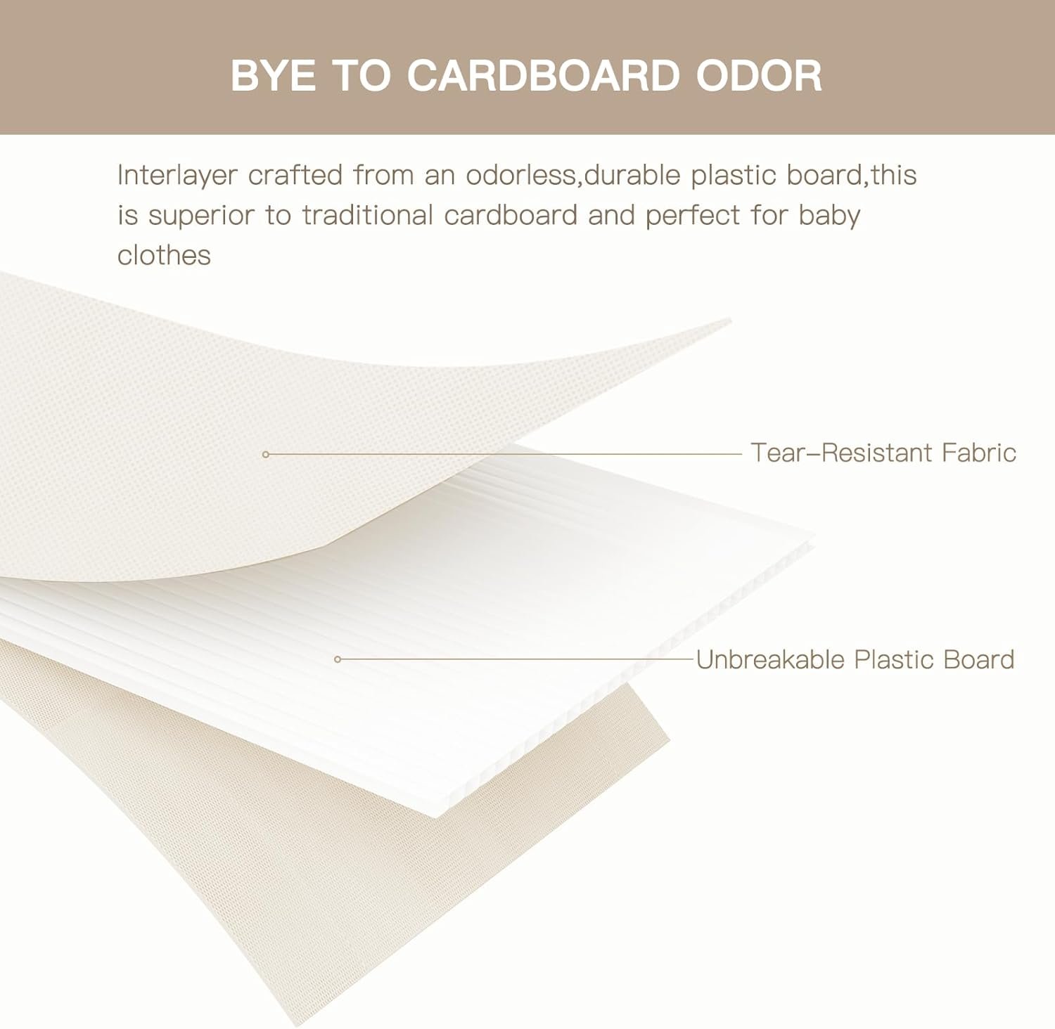 Durable Design:Crafted from sturdy non-woven fabric, these dresser drawer organizers feature high-quality stitching for enhanced durability. Reinforced with heavy plastic boards on the sides and bottom, these bins maintain their shape over time. They are also odorless, making them ideal for storing baby clothes