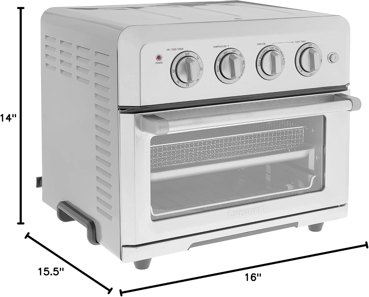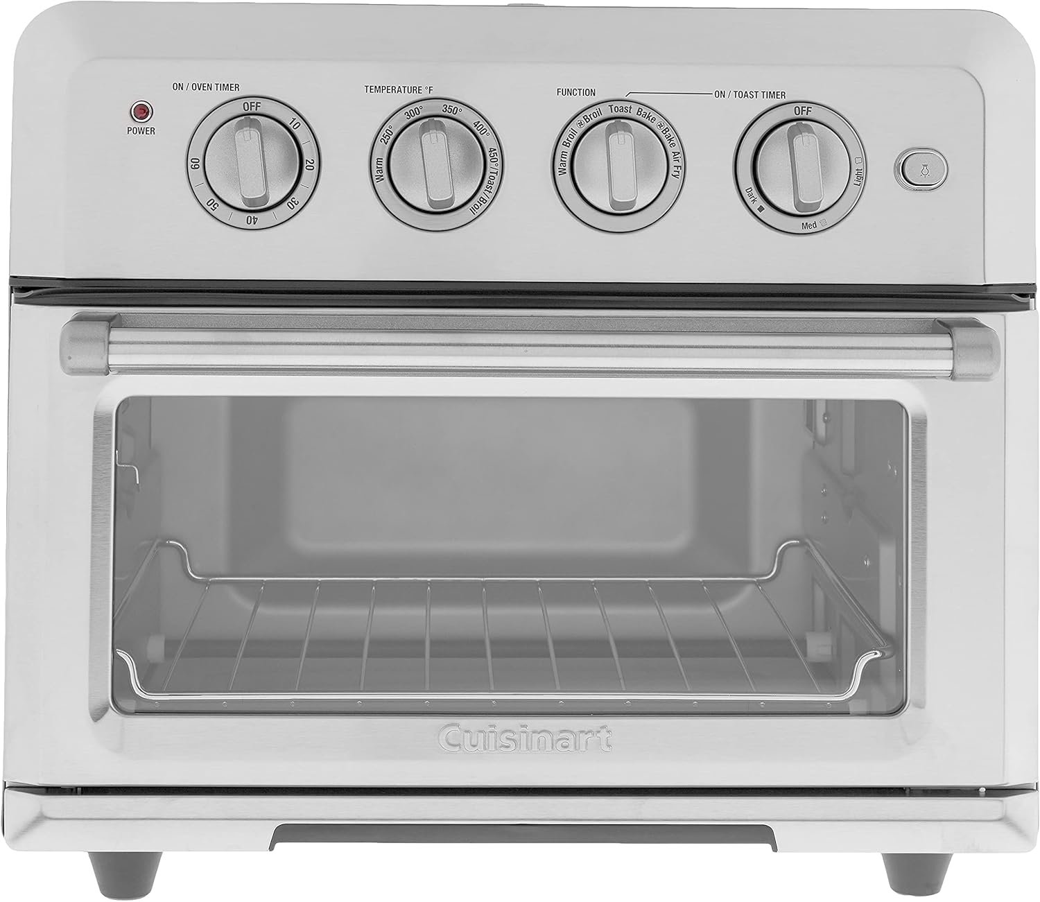 The Cuisinart Air fryer toaster oven is a premium full-size toaster oven with a built-in Air fryer It will not only bake a 4 lb Chicken or 12 in Pizza broil Salmon steaks and toast 6 bagel halves at once It can also air fry up to 3 lbs Of food using little or no oil Powerful ultra-hot air “fries” favorites like wings chicken tenders and fish and chips to crisp golden-brown doneness And since a toaster oven stays on the countertop This is a fryer that never has to be put away Enjoy the crunchy texture and tastes you love – no deep fryer required The Air fryer toaster oven only from Cuisinart!