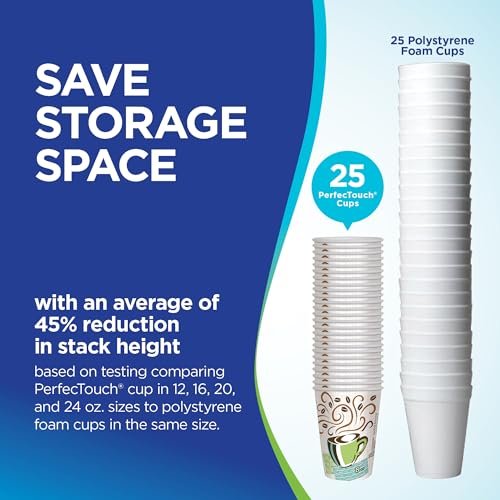 SAVE STORAGE SPACE: With an average of 45% reduction in PerfecTouch disposable coffee cups stack height compared to polystyrene foam cups of the same size