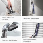 8 Dyson-engineered accessories include the tangle free turbine tool, combination tool, multi-angle brush, stair tool, reach under tool, carbon fiber soft dusting brush, mattress tool and tool bag.