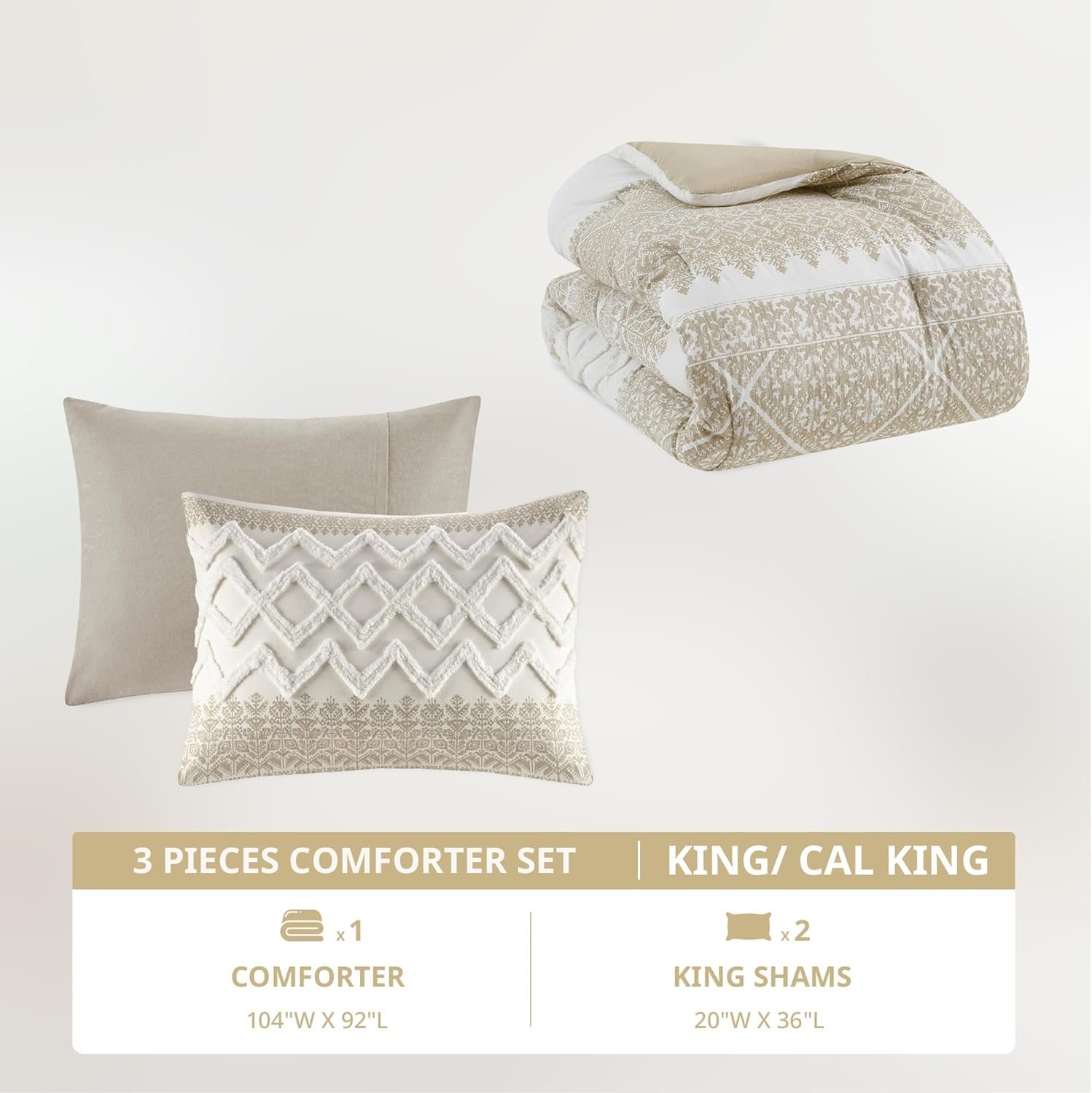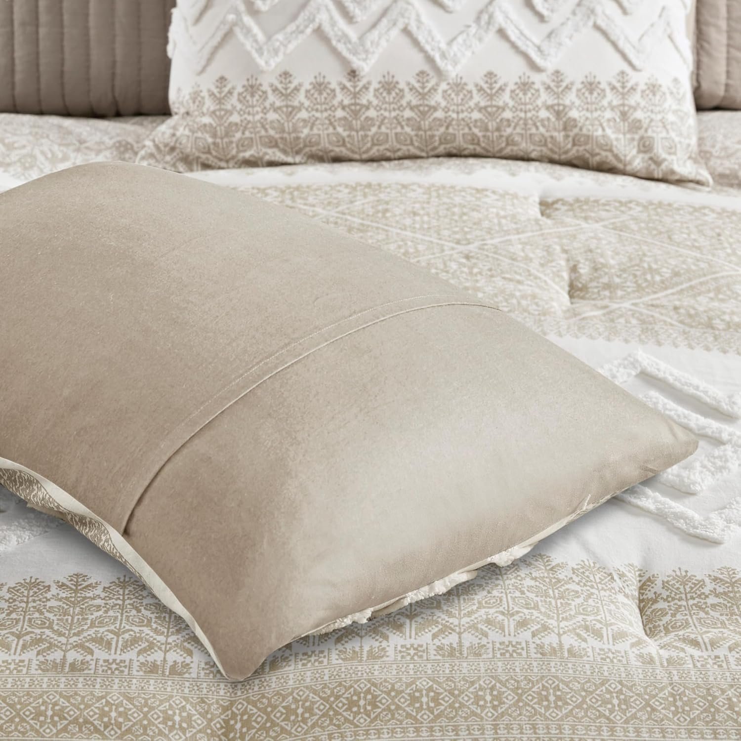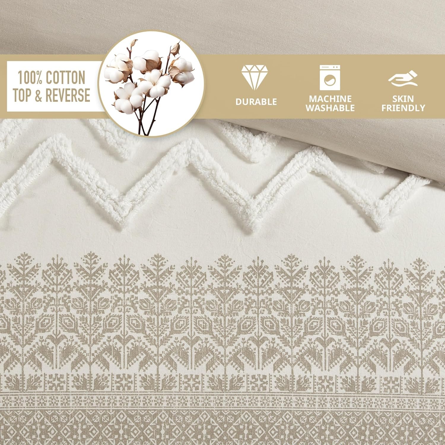 Transform your bedroom with the charming shabby chic allure of the INK+IVY Mila 3 Piece Cotton Comforter Set with Chenille Tufting. The cotton comforter flaunts an updated taupe botanic print, on a natural white ground, with tufted white chenille, in a chevron design, to create a charming farmhouse look. A solid taupe reverse complements the top of the comforter. Two matching shams beautifully mimic the design of the comforter, completing the farmhouse comforter set. Machine washable, this cotton tufted comforter set offers soft comfort and a vivid touch that elevates your bedroom decor. This comforter is OEKO-TEX certified, meaning it does not contain any harmful substances or chemicals to ensure quality comfort and wellness.