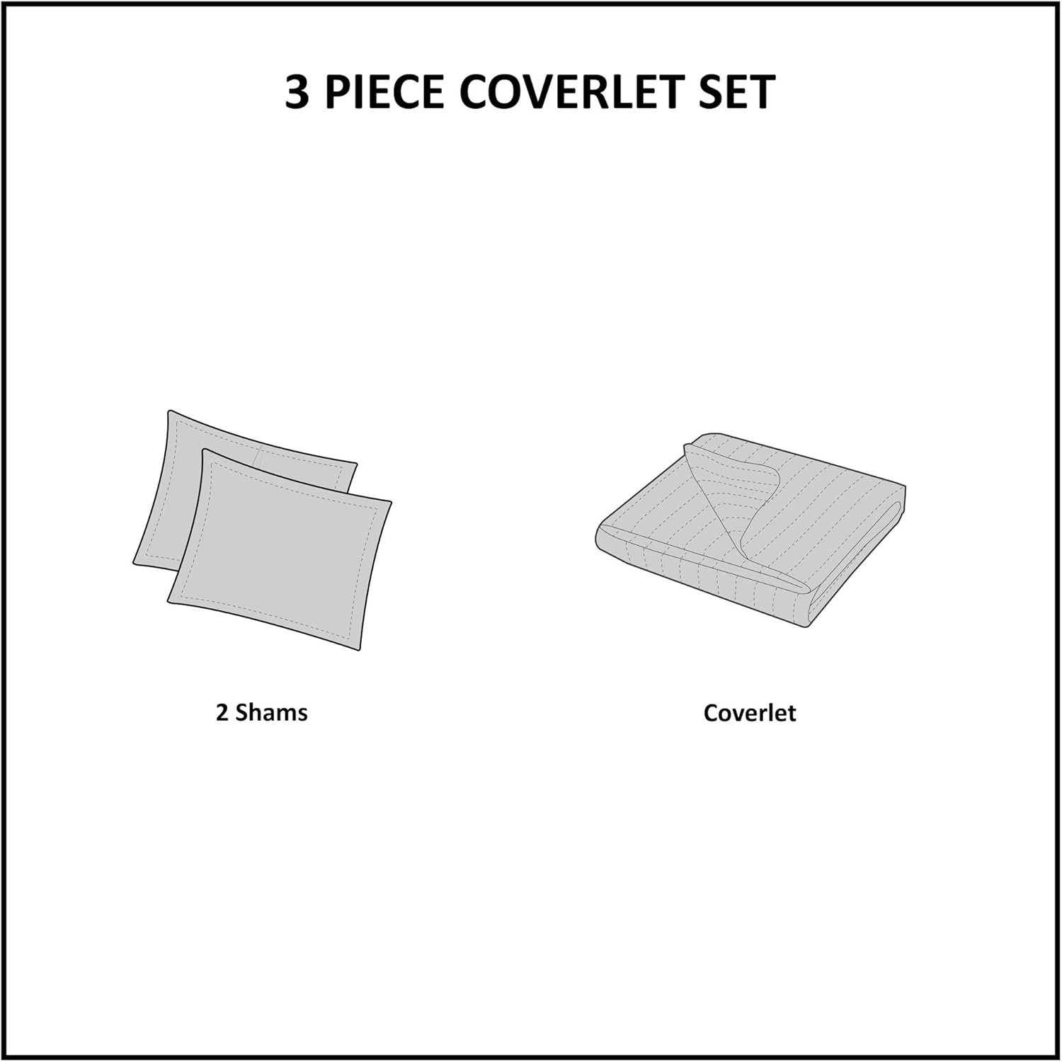 Set includes: 1 Coverlet: 104″W x 92″L, 2 King Shams: 20″W x 36″L + 0.5″D