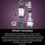 WHAT’S INCLUDED: 1800 PW Motor Base, 72 oz. Pitcher, 64 oz. Food Processor Bowl with Feed Chute Lid, Total Crushing and Chopping Blade Assembly, 24 oz. Single-Serve Cup & Lid, Hybrid Edge Blade, Chopping Blade, Dough Blade, Slicing/Shredding Disc.
