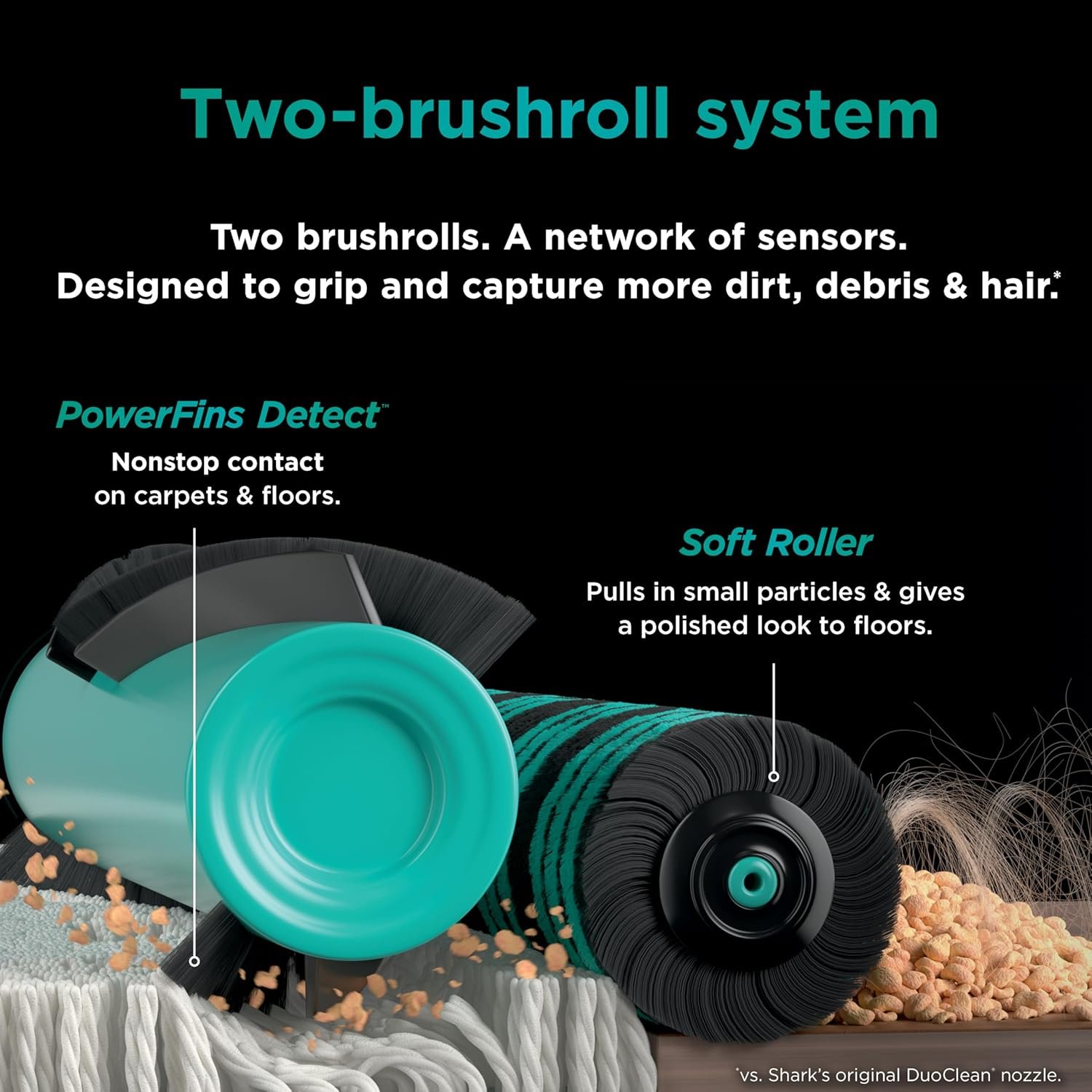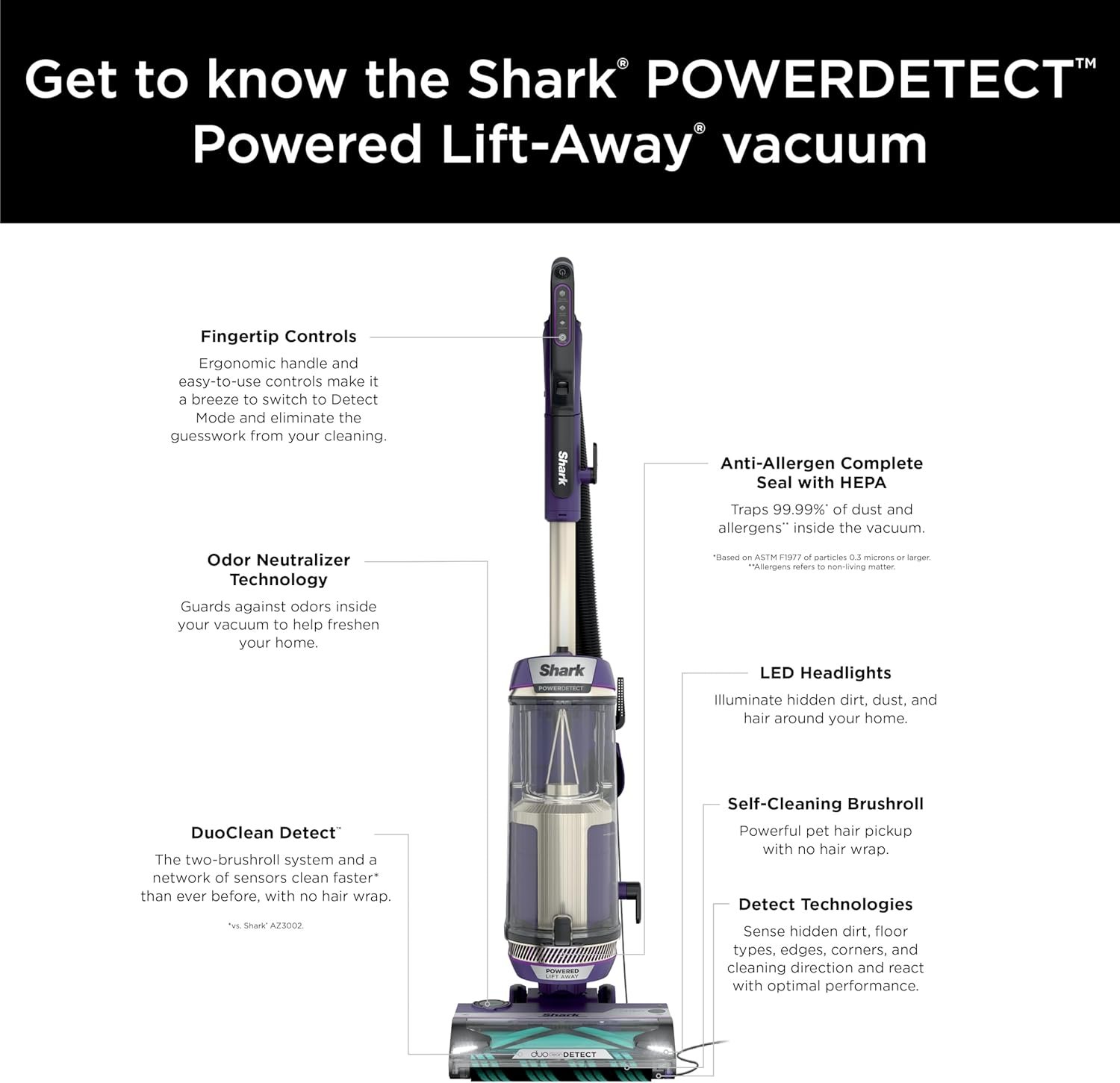The Shark POWERDETECT upright vacuum combines the most powerful suction, ultra-powerful hair pick-up and Shark’s most advanced cleaning technology to deliver the best overall cleaning of any vacuum*. It features the new DuoClean Detect nozzle which includes two brushrolls and a network of proprietary sensors that automatically sense and react to hidden dirt by boosting suction and brushroll speed when you need it most across floor type, corners, edges, and it even detects direction for powerful suction in forward and reverse to grip and capture more dirt, debris & hair than the original DuoClean nozzle. Large piles, fine dust, and & pet hair are no match for DuoClean Detect. Shark’s Odor Neutralizer Technology guards against bad odors inside your vacuum to help freshen your home. Plus, Anti-Allergen Complete Seal with HEPA filtration seals and traps 99.99%** of dust, dander, and allergens*** inside of the vacuum, and out of the air you breathe. For above-floor cleaning, you can Lift Away the detachable pod and take your cleaning to stairs, furniture, windowsills, and more. In addition, when you lift away the pod, you transform your vacuum into a stick, for easy motorized cleaning under furniture. *Based on a geomean of combined tests -IEC62885-2 Sec 5.3 FWD, IEC62885-2 Sec 5.3 REV, IEC62885-2 Sec 5.5 FWD, IEC62885 Sec 5.5 REV vs. upright market” **Based on ASTM F1977, down to .3 microns. ***Allergens refers to non-living matters.